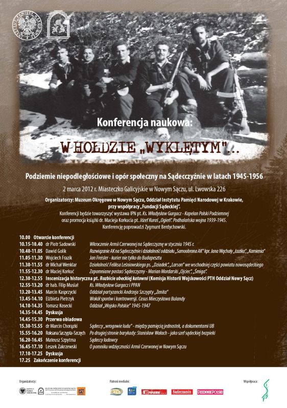 W związku z przypadającym 1 marca Narodowym Dniem Pamięci „Żołnierzy Wyklętych” Oddział IPN w Krakowie wspólnie z Muzeum Okręgowym w Nowym Sączu oraz we współpracy z „Fundacją Sądecką” przygotował konferencję naukową poświęconą zbrojnej i politycznej działalności niepodległościowej na terenie powiatu nowosądeckiego po 1945 r. Podczas konferencji zaprezentowana została ewolucja struktur konspiracji w regionie – od Armii Krajowej, poprzez oddziały poakowskie, po ukrywające się przed bezpieką grupy przetrwania. Prelegenci przedstawili także najważniejsze postaci struktur niepodległościowych związanych z tym regionem, jak również zapomnianych bohaterów zmagań z komunistycznym terrorem.