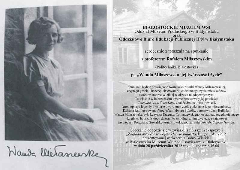 W dniu 28 października 2012 r. w Białostockim Muzeum Wsi w Osowiczach odbył się finisaż wystawy „Zagłada dworów w województwie białostockim po 1939 r.” przygotowanej w OBEP IPN w Białymstoku. Kuratorem wystawy jest dr Ewa Rogalewska. Wystawa była eksponowana w zrekonstruowanym dworze z Bobry Wielkiej, w którym przed wojną swoje najpoczytniejsze książki napisała Wanda Miłaszewska, autorka takich powieści jak np.: „Zatrzymany zegar”, „Księżniczka Dagny” czy „Bogactwo”. W trakcie finisażu prof. zw. dr hab. Rafał Miłaszewski z Politechniki Białostockiej wygłosił wykład pt. „Wanda Miłaszewska. Twórczość i życie”. W spotkaniu wzięło udział kilkadziesiąt osób oraz dziennikarze.