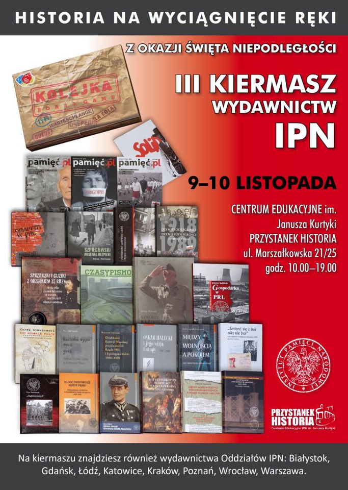 Z okazji Święta Niepodległości IPN zorganizowałł III kiermasz swoich wydawnictw, który odbył się 9 i 10 listopada w stołecznym Centrum Edukacyjnym IPN im. Janusza Kurtyki „Przystanek Historia” (ul. Marszałkowska 21/25). Można można było zaopatrzyć się w wydane przez Instytut książki, albumy, pisma popularnonaukowe i gry edukacyjne – zarówno publikacje centrali Instytutu, jak i oddziałów IPN w Białymstoku, Gdańsku, Łodzi, Katowicach, Krakowie, Poznaniu, Wrocławiu i Warszawie.
