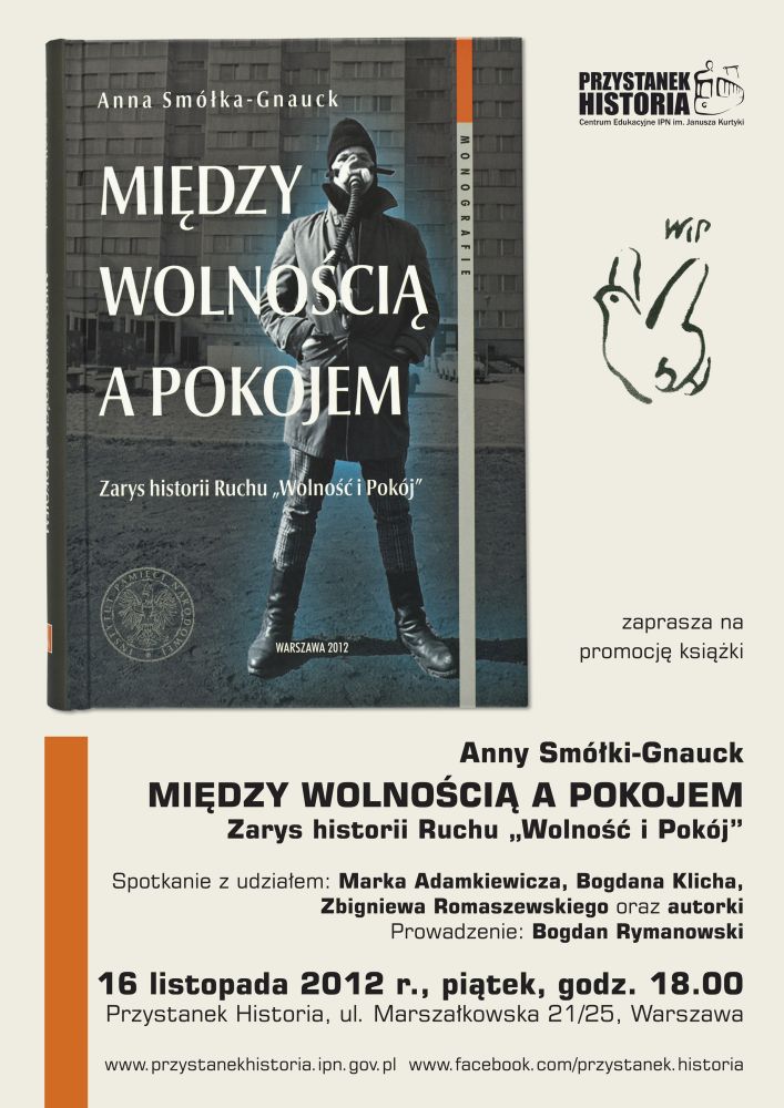 W piątkowy (16 listopada 2012 r.) wieczór w Centrum Edukacyjnym IPN w Warszawie odbyła się promocja książki Anny Smółki-Gnauck „Między wolnością a pokojem. Zarys historii Ruchu »Wolność i Pokój«”, poświęconej historii jednej z najważniejszych organizacji antykomunistycznej opozycji lat osiemdziesiątych XX wieku . Wydana przez IPN praca Smółki-Gnauck to pierwsza historia WiP-u.