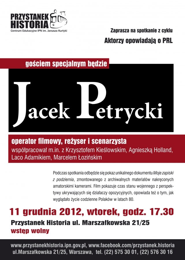 Z cyklu „Aktorzy opowiadają o PRL” spotkanie z Jackiem Petryckim – Warszawa, 11 grudnia 2012, „Przystanek Historia” – Centrum Edukacyjne IPN im. Janusza Kurtyki, Marszałkowska 21/25