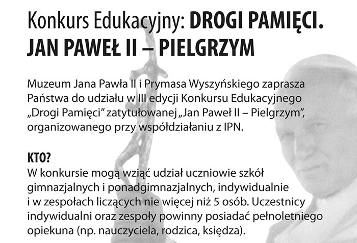 Zapraszamy wszystkich chętnych do udziału w konkursie edukacyjnym organizowanym przez Muzeum Jana Pawła II i Prymasa Wyszyńskiego we współpracy z Instytutem Pamięci Narodowej. Tegoroczna, trzecia edycja, nosi tytuł „Jan Paweł II – Pielgrzym”.