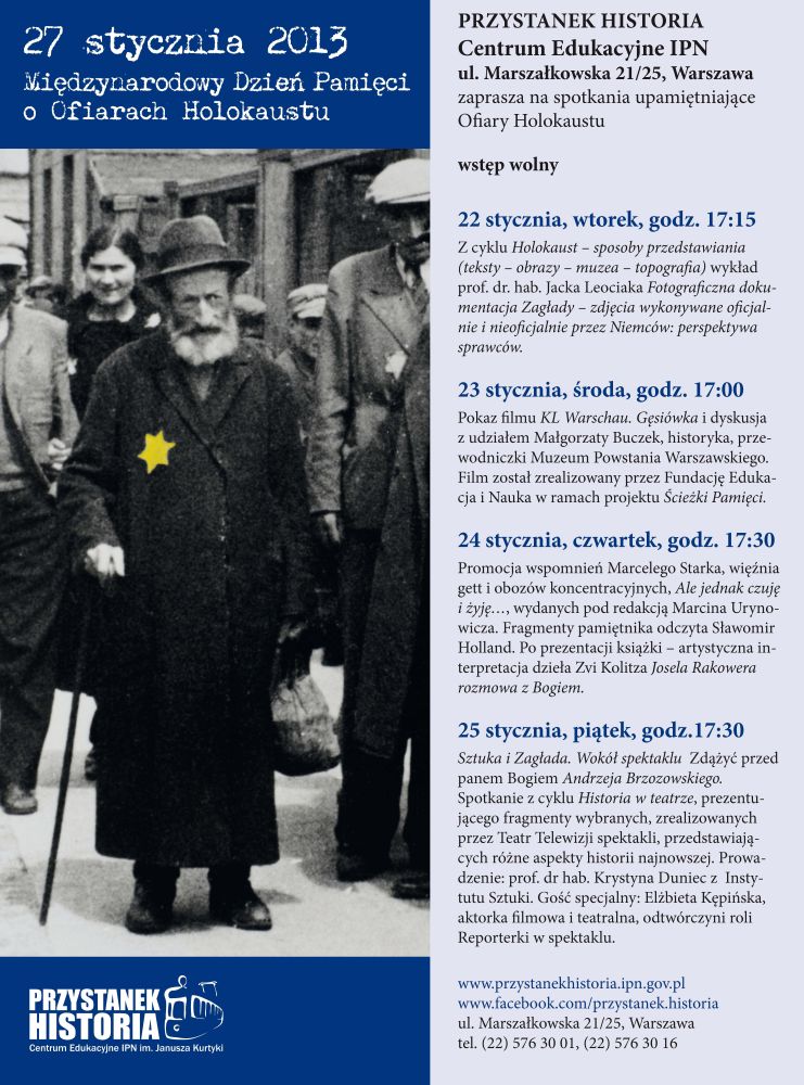 W związku z przypadającym 27 stycznia Międzynarodowym Dniem Pamięci o Ofiarach Holokaustu zapraszamy na spotkania upamiętniające, które odbędą się w Centrum Edukacyjnym IPN Przystanek Historia w Warszawie.