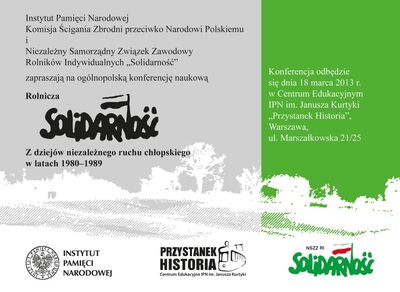 Instytut Pamięci Narodowej – Komisja Ścigania Zbrodni przeciwko Narodowi Polskiemu i Niezależny Samorządny Związek Zawodowy Rolników Indywidualnych „Solidarność” zapraszają na ogólnopolską konferencję naukową „Rolnicza »Solidarność«. Z dziejów niezależnego ruchu chłopskiego w latach 1980–1989”.