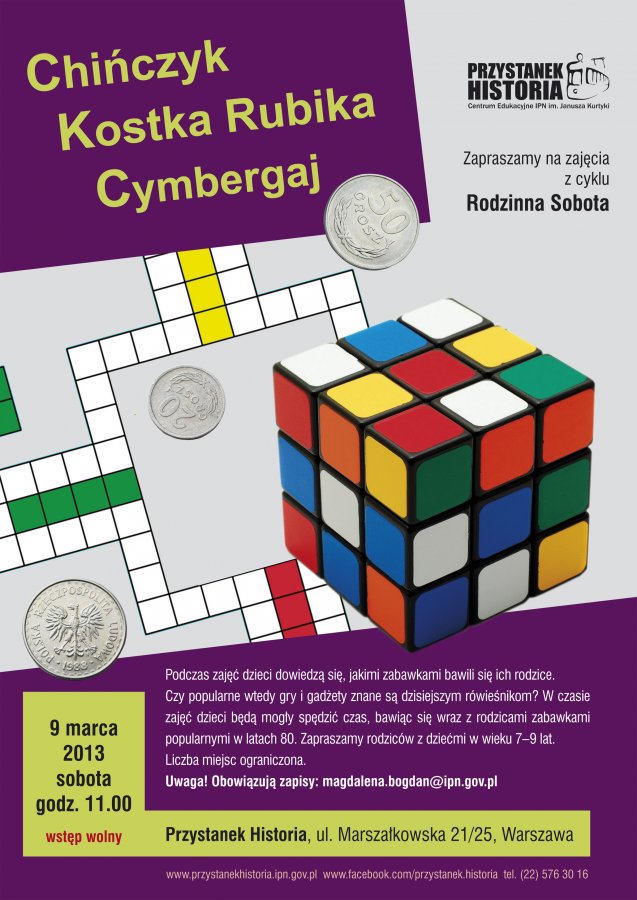 Z cyklu „Rodzinna Sobota” zajęcia „Chińczyk, Kostka Rubika i Cymbergaj”. Podczas zajęć dzieci dowiedzą się, jakimi zabawkami bawili się ich rodzice. Czy popularne wtedy gry i gadżety znane są dzisiejszym rówieśnikom? Dzieci będą mogły spędzić czas, bawiąc się wraz z rodzicami zabawkami popularnymi w latach 80. Zapraszamy rodziców z dziećmi w wieku 7-9 lat. Liczba miejsc ograniczona.