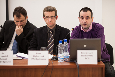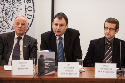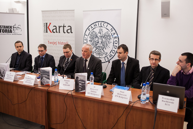 Uczestnicy konferencji, od lewej: prowadzący Tomasz Kozłowski z BEP IPN, dr Artur Jóźwik z Ośrodka Karta, dr hab. Mirosław Golon z gdańskiego oddziału IPN, senator RP Jan Rulewski, dr Krzysztof Osiński i Piotr Rybarczyk z bydgoskiej delegatury IPN oraz P -