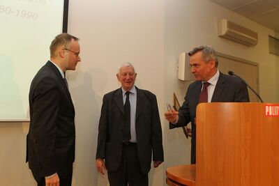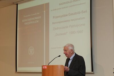 Prof. Jerzy Holzer wygłasza laudację nt. nagrodzonej książki Przemysława Gasztolda-Senia o Zjednoczeniu Patriotycznym Grunwald -
