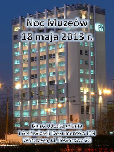 Podczas Nocy Muzeów 18 maja br. Biuro Udostępniania i Archiwizacji Dokumentów po raz ostatni otworzy dla zwiedzających archiwum w budynku IPN przy ul. Towarowej 28 (w godz. 17.00–24.00). Goście będą mieli możliwość zapoznania się z codzienną pracą archiwistów. Zaprezentowane zostaną m.in. urządzenia do skanowania materiałów aktowych i mikrofilmów oraz do digitalizacji materiałów fotograficznych i opracowywania kopii cyfrowych fotografii, wideokomparator, a także urządzenia, narzędzia i materiały do konserwacji dokumentów źródłowych.
