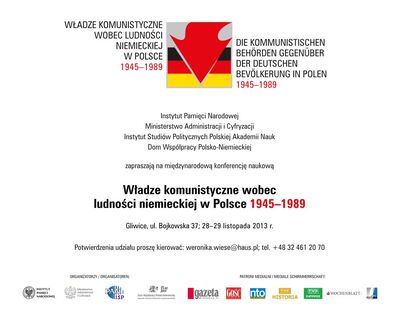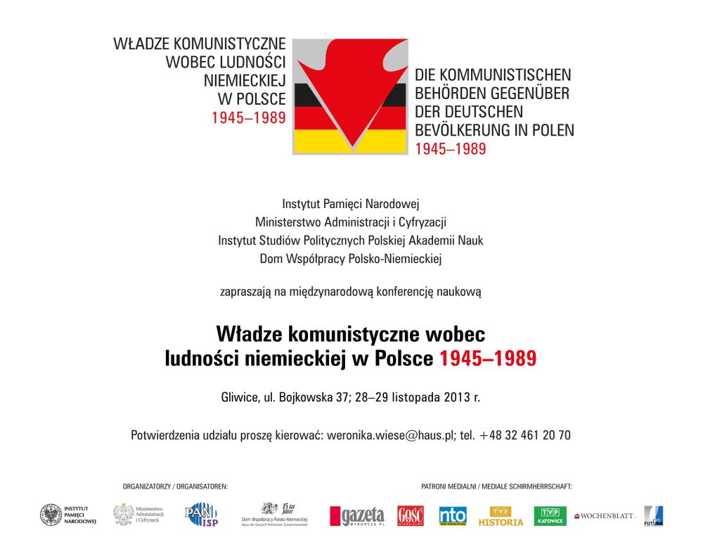 Instytut Pamięci Narodowej – Komisja Ścigania Zbrodni przeciwko Narodowi Polskiemu, Ministerstwo Administracji i Cyfryzacji, Instytut Studiów Politycznych Polskiej Akademii Nauk oraz Dom Współpracy Polsko-Niemieckiej w Gliwicach zapraszają na międzynarodową konferencję naukową