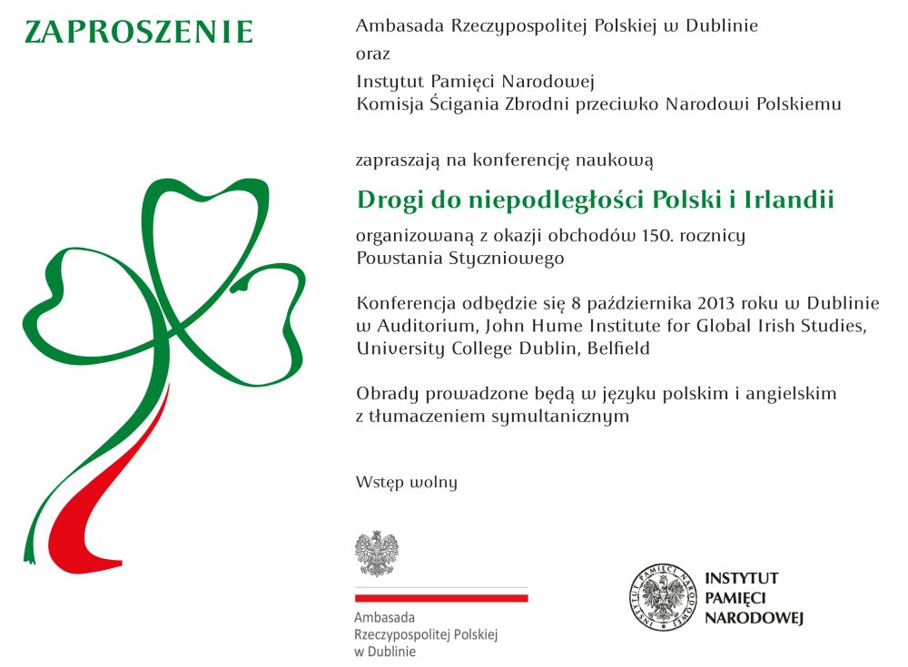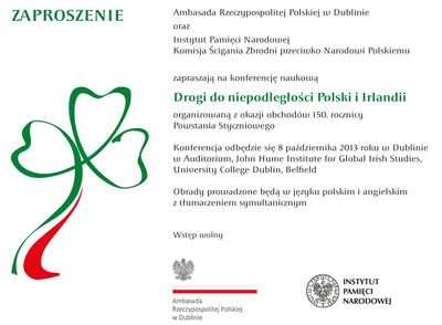 W dniu 8 października 2013 r. w Dublinie, w Auditorium John Hume Insitute for Globar Irish Studies (University College, Dublin, Belfield) odbędzie się konferencja naukowa zatytułowana „Drogi do niepodległości Polski i Irlandii”. Spotkanie organizowane jest przez Ambasadę Rzeczypospolitej Polskiej w Dublinie i Instytut Pamięci Narodowej – Komisję Ścigania Zbrodni przeciwko Narodowi Polskiemu z okazji obchodów 150. rocznicy Powstania Styczniowego.