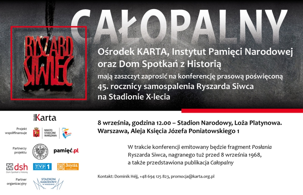 Instytut Pamięci Narodowej, Dom Spotkań z Historią i Ośrodek Karta zorganizowały konferencję prasową dla dziennikarzy w związku z 45. rocznicą samospalenia Ryszarda Siwca. Konferencja odbyła się 8 września 2013 o godz. 12.00 w Loży Platynowej Stadionu Narodowego w Warszawie. Gościem specjalnym konferencji był Wit Siwiec – syn Ryszarda Siwca
