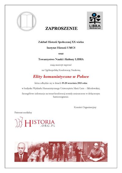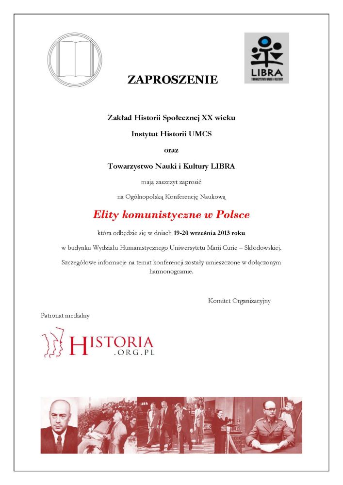 Zakład Historii Społecznej XX wieku Instytut Historii UMCS oraz Towarzystwo Nauki i Kultury LIBRA zapraszają na Ogólnopolską Konferencję Naukową „Elity komunistyczne w Polsce”, która odbędzie się w dniach 19–20 września 2013 roku w budynku Wydziału Humanistycznego Uniwersytetu Marii Curie-Skłodowskiej w Lublinie. W konferencji wezmą udział m.in. pracownicy Instytutu Pamięci Narodowej. Szczegółowe informacje na temat konferencji zostały umieszczone w dołączonym programie.