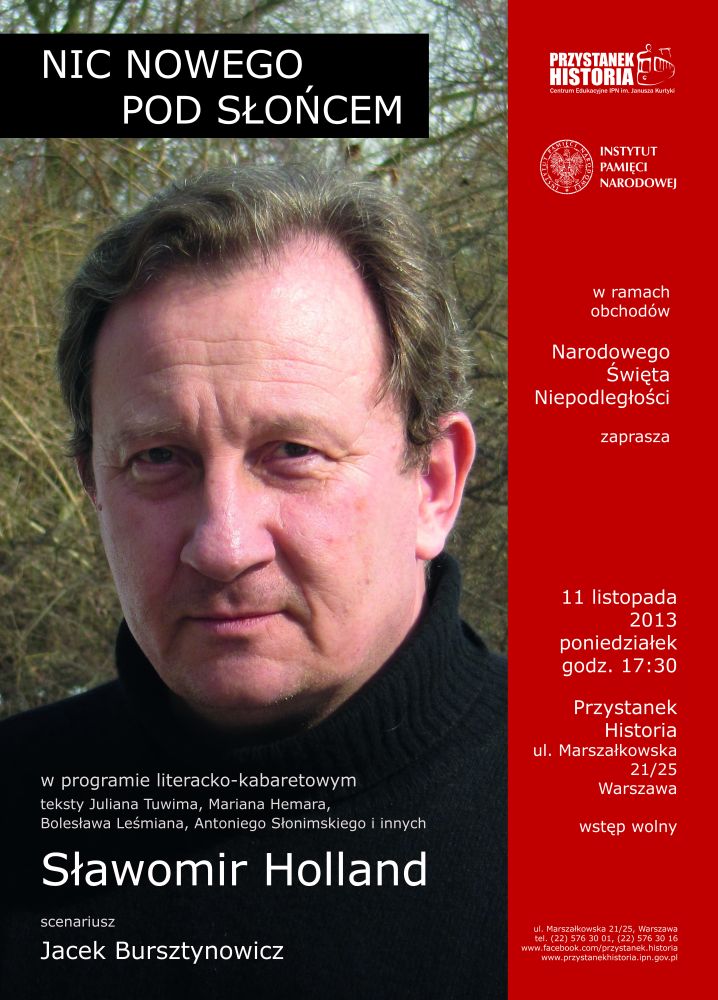 Z okazji Narodowego Święta Niepodległości Centrum Edukacyjne im. Janusza Kurtyki Przystanek Historia zaprasza na widowisko kabaretowo-literackie „Nic nowego pod słońcem", czyli utwory Juliana Tuwima, Mariana Hemara, Bolesława Leśmiana, K. I. Gałczyńskiego w wykonaniu aktora teatru „Ateneum" w Warszawie Sławomira Hollanda. Spektakl odbędzie się 11 listopada o godz. 17:30. Wstęp wolny.