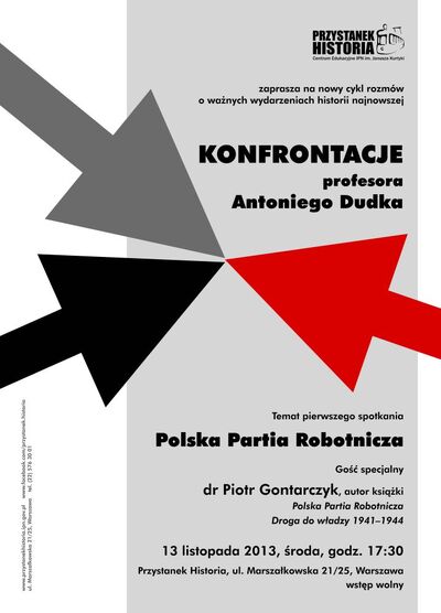 Przystanek Historia – Centrum Edukacyjne IPN im. Janusza Kurtyki zaprasza na Konfrontacje profesora Antoniego Dudka, czyli rozmowy o historii najnowszej. Przedmiotem dyskusji będzie Polska Partia Robotnicza. Prof. Antoni Dudek i jego gość – dr Piotr Gontarczyk, autor książki Polska Partia Robotnicza. Droga do władzy 1941–1944, spróbują określić tożsamość PPR, a także odpowiedzieć na pytania, czy założenia programowe partii były wiernym odzwierciedleniem ideologii komunistycznej, jaki był jej stosunek do przeszłości i jak kształtowała swój mit założycielski. Początek spotkania o godz. 17:30.