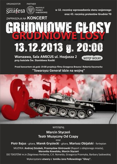 Koncert w hołdzie ofiarom Grudnia '70 i stanu wojennego odbędzie się w Warszawie, w sali Amicus przy kościele św. Stanisława Kostki (ul. Hozjusza 2) – 13 grudnia 2013, o godz. 20:00.