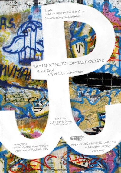 Przystanek Historia – Centrum Edukacyjne IPN im. Janusza Kurtyki zaprasza na rozmowę o spektaklu „Kamienne niebo zamiast gwiazd" Marcina Cecki w reż. Krzysztofa Garbaczewskiego. Spektakl ten to „nowoczesny projekt teatralny, w którym historyczny temat spotyka się z radykalnym eksperymentem scenicznym. Inspirując się powieścią Jerzego Krzysztonia Kamienne niebo, która o Powstaniu Warszawskim opowiada z perspektywy ukrywających się i uwięzionych w piwnicy cywilów, twórcy – reżyser Krzysztof Garbaczewski i autor tekstu Marcin Cecko – konstruują świat, w którym izolacja, poczucie zamknięcia i desperackie próby przeżycia stają się uniwersalną metaforą funkcjonującą dziś, a to, co martwe, powstaje z grobu, by poruszać się wśród żywych" (z recenzji spektaklu zamieszczonej na stronie Nowego Teatru).