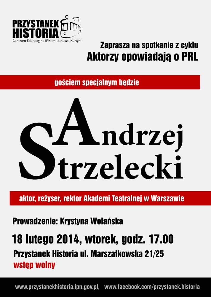 Zapraszamy na spotkanie z prof. Andrzejem Strzeleckim – aktorem i reżyserem teatralnym, filmowym i telewizyjnym, przez lata związanym z warszawskim Teatrem Rampa. W 2004 r. uzyskał tytuł profesora sztuk teatralnych, a od 2008 r. jest rektorem Akademii Teatralnej im. Aleksandra Zelwerowicza w Warszawie. Spotkanie poprowadzi Krystyna Wolańska.