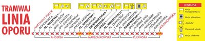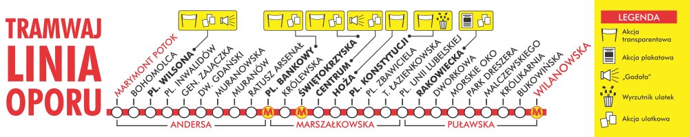 Edukacyjny tramwaj „Linia Oporu", poświęcony historii Grup Oporu „Solidarni", będzie kursował na trasie Marymont Potok – pl. Wilsona – pl. Bankowy – Marszałkowska – Puławska – Wyścigi. Będzie w nim można samodzielnie wykonać 3 rodzaje ulotek na maszynie drukarskiej z epoki oraz zagrać w ZnajZnak, obejrzeć wystawę poświęconą drukom i ulotkom z lat 80. XX wieku, spotkać działaczy Grup Oporu. Dzieci, które wsiądą do tramwaju, otrzymają również specjalne pamiątkowe stemple na rękę.