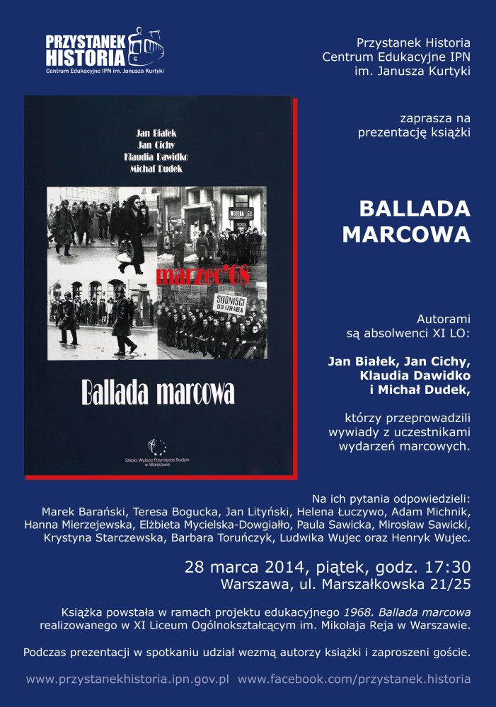 Centrum Edukacyjne IPN im. Janusza Kurtyki Przystanek Historia zaprasza na prezentację książki absolwentów XI LO im. Mikołaja Reja w Warszawie pt. Ballada marcowa. Publikacja powstała w ramach projektu Uczniowie obchodzą ważne rocznice historyczne, realizowanego w CE Przystanek Historia we współpracy z warszawskimi szkołami.