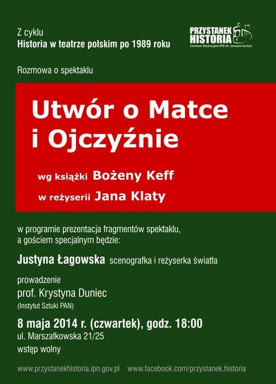 Tym razem podczas spotkania z cyklu Historia w teatrze polskim po 1989 roku – rozmowa o spektaklu Jana Klaty Utwór o Matce i Ojczyźnie według książki Bożeny Keff. W programie prezentacja fragmentów przedstawienia i spotkanie z Justyną Łagowską – scenografką i reżyserką światła, absolwentką ASP, autorką scenografii do wielu spektakli Jana Klaty. Prowadzenie: prof. Krystyna Duniec (IS PAN).
