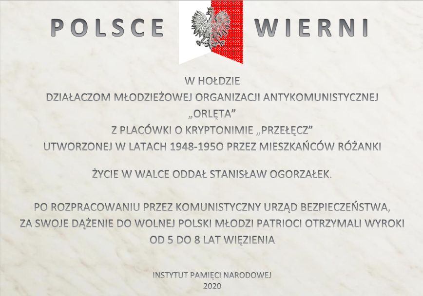 8 marca 2020 – odsłonięcie pamiątkowej tablicy, poświęconej działaczom młodzieżowej organizacji antykomunistycznej „Orlęta” z placówki o kryptonimie „Przełęcz”, utworzonej w latach 1948–1950 przez mieszkańców Różanki (gm. Wiśniowa, pow. strzyżowski, woj. podkarpackie). W czasie walki życie oddał Stanisław Ogorzałek – zabity przez UB w 1952 r. w Szufnarowej. Pozostali członkowie tej organizacji po rozpracowaniu przez komunistyczny Urząd Bezpieczeństwa zostali skazani na kary od 5 do 8 lat więzienia.