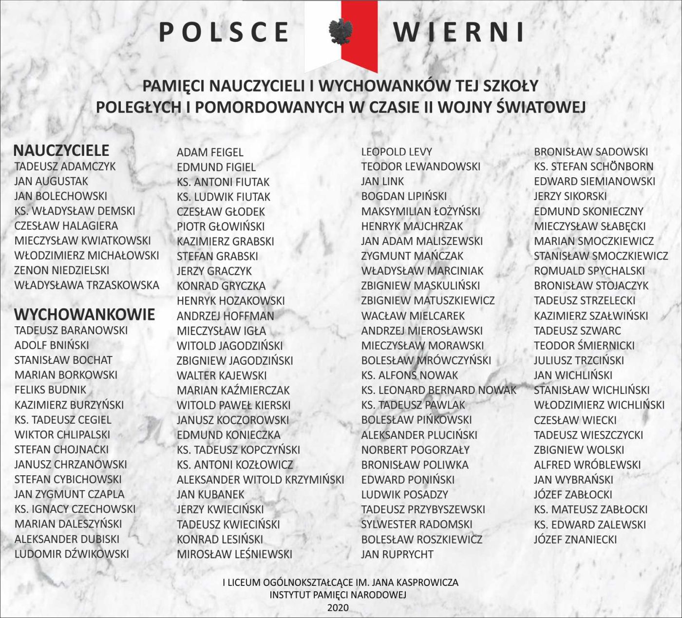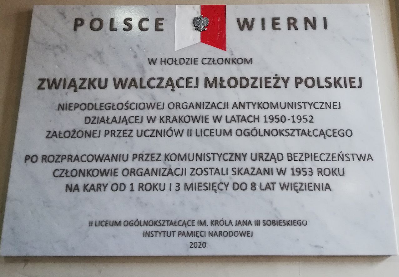 13 marca 2020ODWOŁANE odsłonięcie tablicy, poświęconej Związkowi Walczącej Młodzieży Polskiej w budynku II Liceum Ogólnokształcącego im. Króla Jana III Sobieskiego w Krakowie, którego uczniowie w 1950 r. założyli tę organizację.