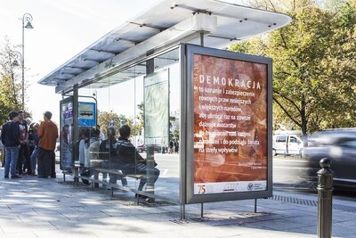 Na citylightach (plakaty głównie na wiatach przystankowych) znalazło się osiem motywów, z których każdy odpowiada jednemu z ośmiu punktów Programu Demokracji Polskiej z odezwy RJN.