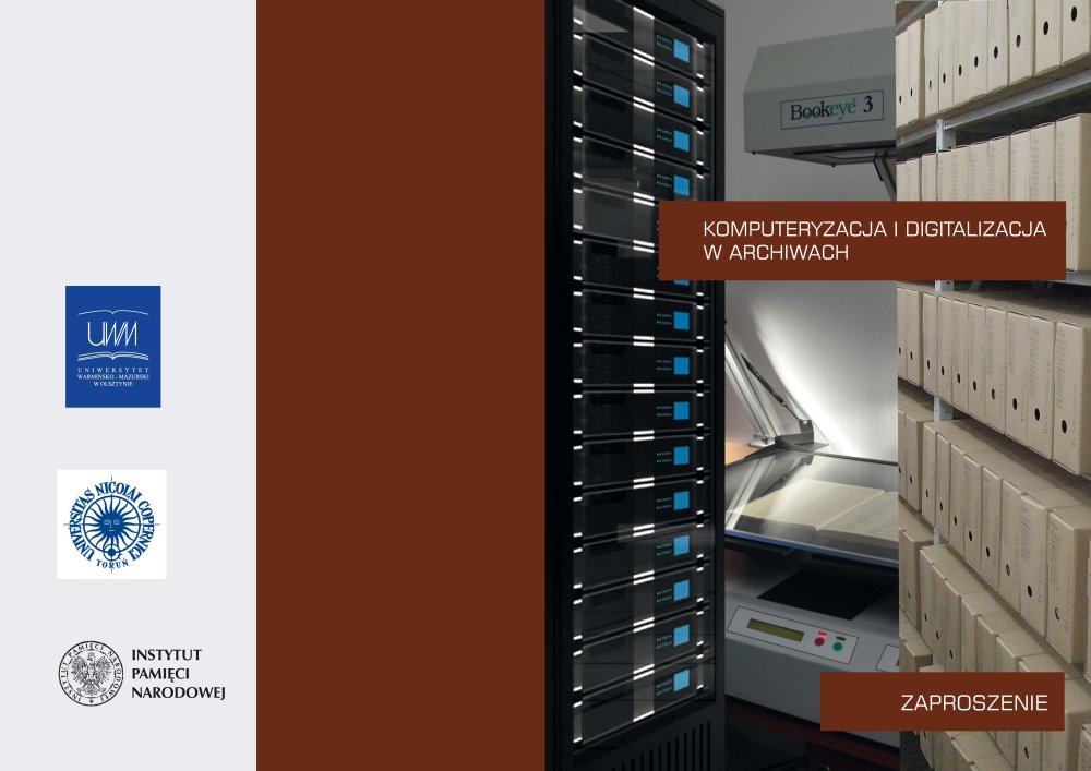 Instytut Pamięci Narodowej, Uniwersytet Warmińsko-Mazurski w Olsztynie i Uniwersytet Mikołaja Kopernika w Toruniu zapraszają na sympozjum naukowe „Komputeryzacja i digitalizacja w archiwach". Sympozjum odbędzie się w dniach 27–28 października 2014 r. w Centrum Edukacji Technologicznej „Stara Kotłownia" Uniwersytetu Warmińsko-Mazurskiego w Olsztynie, ul. Prawocheńskiego 9, sala 1.1 wystawowa, pok. 102.
