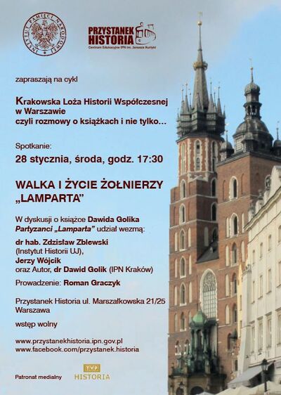 Przystanek Historia Centrum Edukacyjne IPN im. Janusza Kurtyki zaprasza na spotkanie z cyklu Krakowska Loża Historii Współczesnej w Warszawie – dyskusję wokół książki Dawida Golika Partyzanci „Lamparta”. Historia IV batalionu 1. pułku strzelców podhalańskich AK. Spotkanie odbędzie 28 stycznia, o godz. 17:30, na Przystanku Historia przy ul. Marszałkowskiej 21/25 w Warszawie.