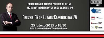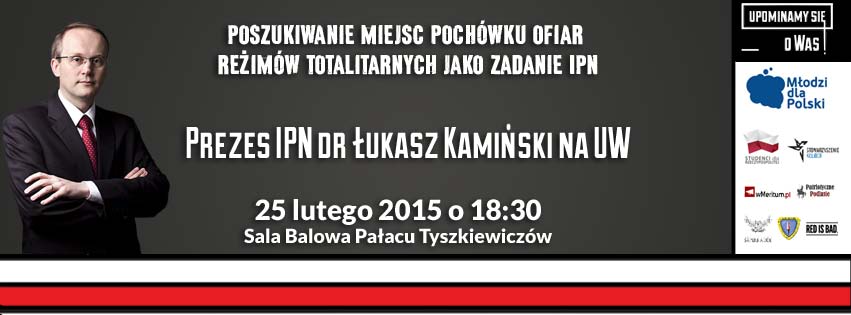 Stowarzyszenie Młodzi dla Polski UW zaprasza na spotkanie z prezesem IPN dr. Łukaszem Kamińskim pt. „Poszukiwanie miejsc pochówku ofiar reżimów totalitarnych jako zadanie IPN”. Spotkanie odbędzie się w środę 25 lutego, o godzinie 18:30, w Sali Balowej Pałacu Tyszkiewiczów w Warszawie przy ul. Krakowskie Przedmieście 32.