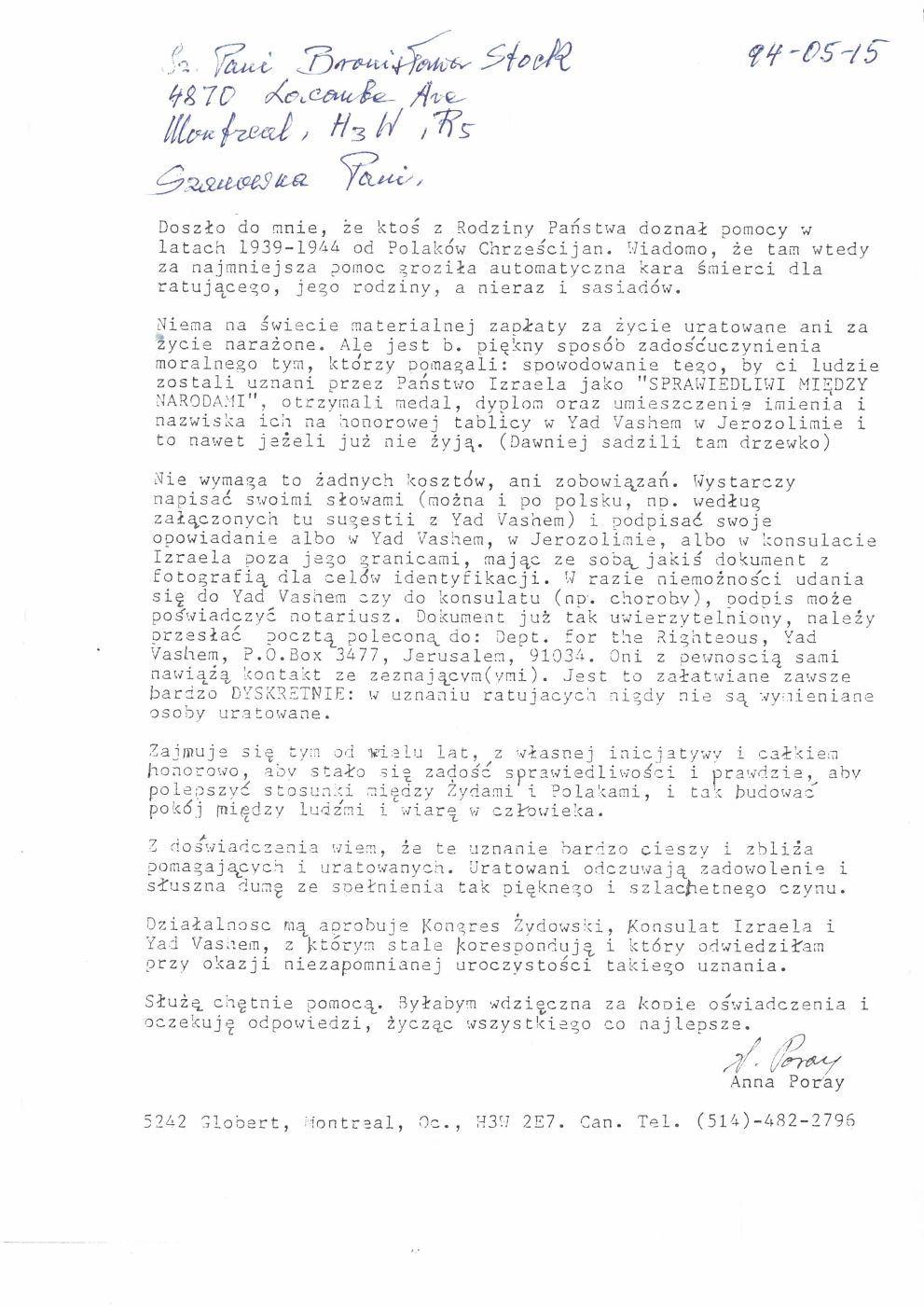 Z okazji Narodowego Dnia Pamięci Polaków ratujących Żydów pod okupacją niemiecką przypominamy postać Anny Poray-Wybranowskiej (1919-2013), polskiej działaczki społecznej z Kanady. Po zakończeniu wojny obronnej 1939 r. przedostała się do Włoch, gdzie studiowała nauki polityczne, otrzymując w 1944 r. stopień doktora. Pod koniec II wojny światowej służyła w Delegaturze Czerwonego Krzyża, a następnie Archiwum i Muzeum 2. Korpusu Polskiego. Po przeniesieniu do Anglii została zdemobilizowana w ramach Polskiego Korpusu Przysposobienia i Rozmieszczenia. W 1947 r. wyszła za maż za mjr. Jana Poray-Wybranowskiego. Po kilku latach pobytu w Argentynie, Poray-Wybranowska wyemigrowała do USA. Pracowała w bibliotekach nowojorskich. Ukończyła studia z bibliotekoznawstwa na Columbia University. W 1961 r. przeniosła się do Kanady. Studiowała slawistykę na Uniwersytecie Montrealskim oraz pracowała w bibliotekach uniwersytetów Quebec i Montreal. Związała się również z Polskim Instytutem Naukowym w Kanadzie, gdzie pracowała jako kierownik Biblioteki Polskiej oraz przez wiele lat pełniła funkcję sekretarza. W 1978 r. założyła charytatywną organizację „Pro Justitia”, której celem była pomoc najbiedniejszym na świecie.