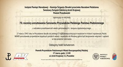 27 marca 1945 roku sowiecka policja polityczna, NKWD aresztowała 16 przywódców Polskiego Państwa Podziemnego, którzy przybyli do Pruszkowa na zaproszenie sowieckich dowódców na rozmowy, na których mieli omówić realizację ustaleń konferencji jałtańskiej. Wśród nich – delegata rządu na kraj i wicepremiera Jana Stanisława Jankowskiego, ostatniego Komendanta Głównego AK gen. Leopolda Okulickiego oraz przewodniczącego Rady Jedności Narodowej Kazimierza Pużaka.