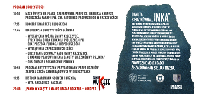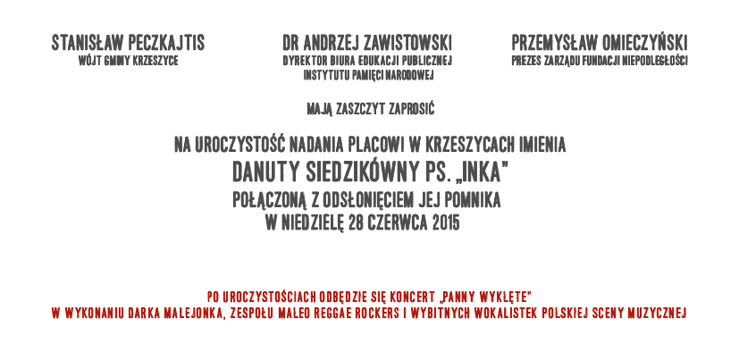 Pomnik „Inki” wspólnie odsłonią Stanisław Peczkajtis i inicjator zmiany Andrzej Zawistowski. Wieczorem dla mieszkańców zaśpiewają „Panny Wyklęte” i Maleo Reggae Rockers.