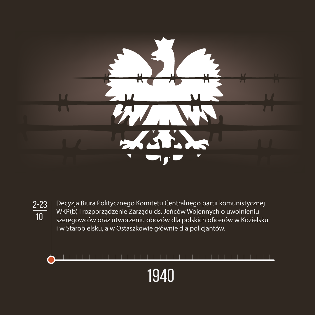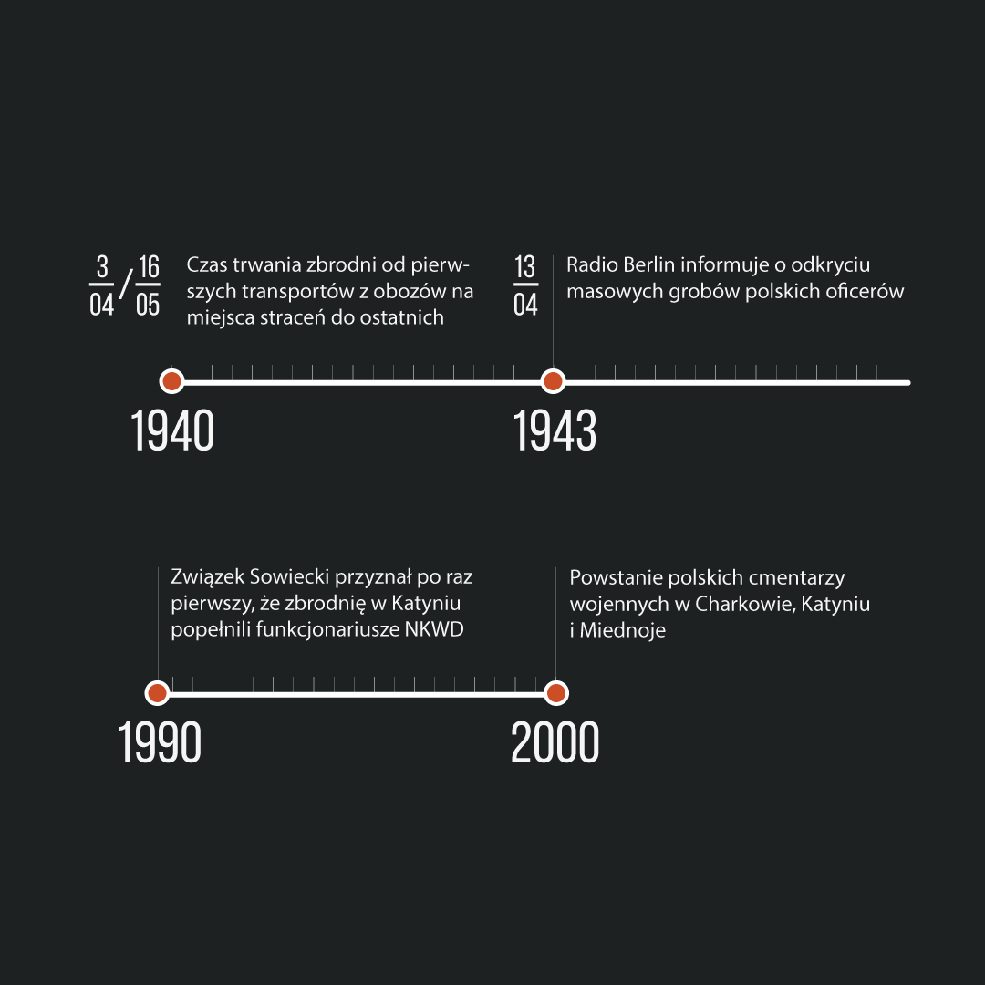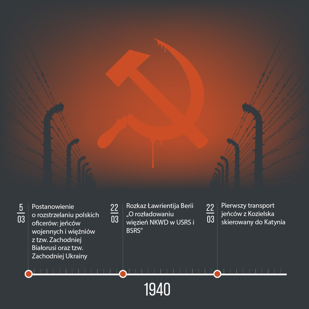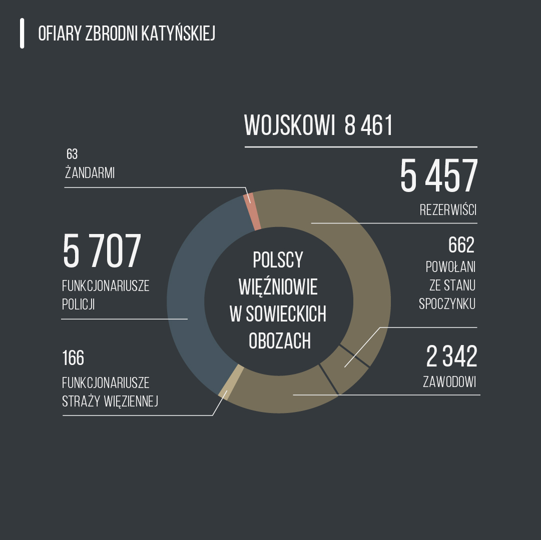 Infografiki przedstawiają historię zbrodni katyńskiej – od genezy do tragicznego wydarzenia. Przygotowany materiał edukacyjny może być prezentowany w całości, a także oddzielnie, jako materiał pomocniczy na lekcjach poświęconych rocznicy 17 września, tematyce obozowej czy wreszcie mordu w Katyniu. Plansze mogą stanowić pomoc dydaktyczną nie tylko na lekcjach historii i wiedzy o społeczeństwie, ale także języka polskiego i godziny wychowawczej. Przeznaczeniem grafik jest prezentacja multimedialna w trakcie zajęć lekcyjnych – można je pobrać także do wydruku w celu sporządzenia miniwystawy lub zaprezentować w gablotach i gazetkach szkolnych.