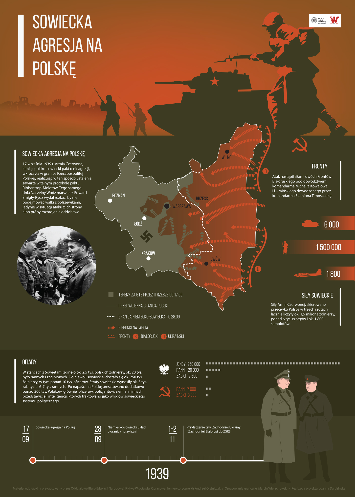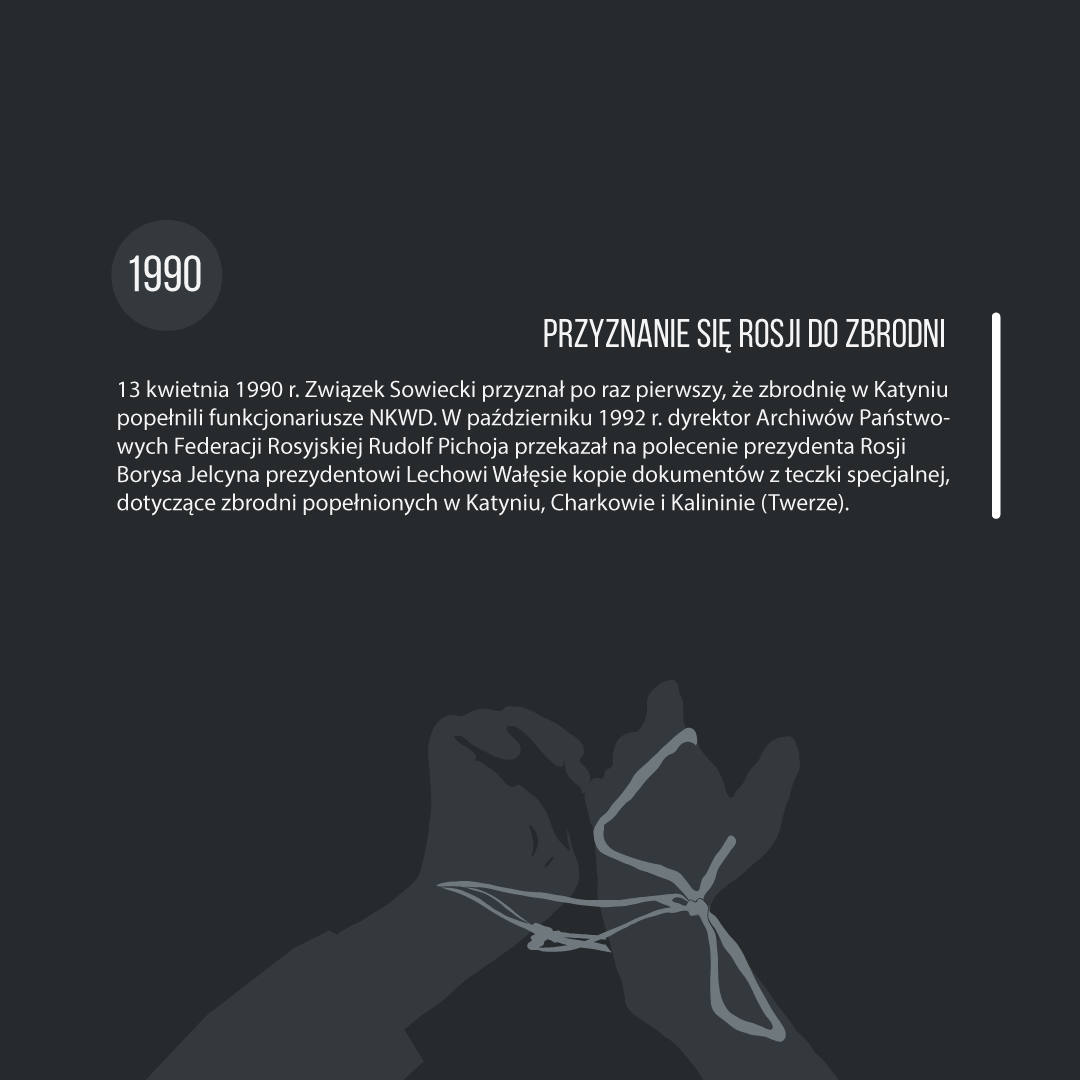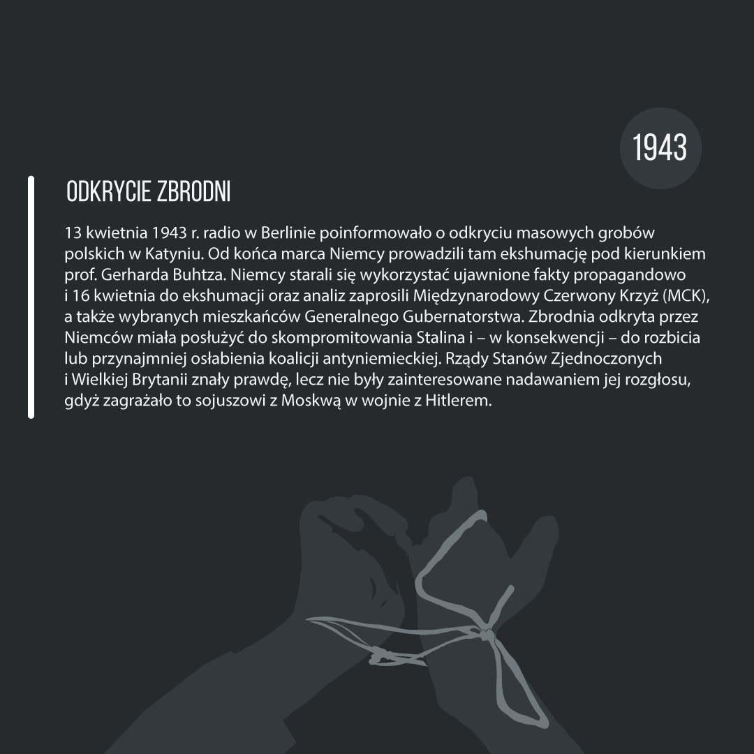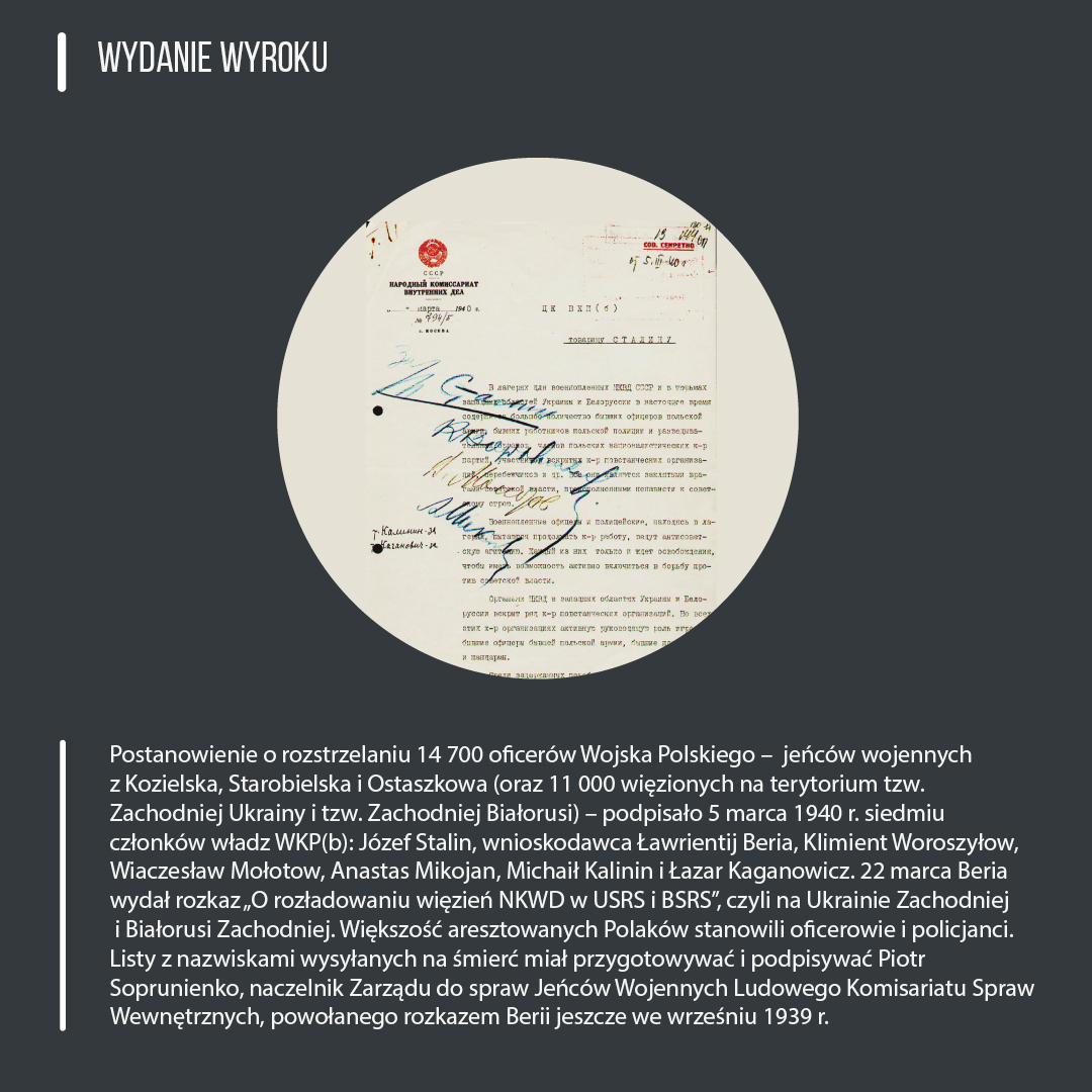 Infografiki przedstawiają historię zbrodni katyńskiej – od genezy do tragicznego wydarzenia. Przygotowany materiał edukacyjny może być prezentowany w całości, a także oddzielnie, jako materiał pomocniczy na lekcjach poświęconych rocznicy 17 września, tematyce obozowej czy wreszcie mordu w Katyniu. Plansze mogą stanowić pomoc dydaktyczną nie tylko na lekcjach historii i wiedzy o społeczeństwie, ale także języka polskiego i godziny wychowawczej. Przeznaczeniem grafik jest prezentacja multimedialna w trakcie zajęć lekcyjnych – można je pobrać także do wydruku w celu sporządzenia miniwystawy lub zaprezentować w gablotach i gazetkach szkolnych.
