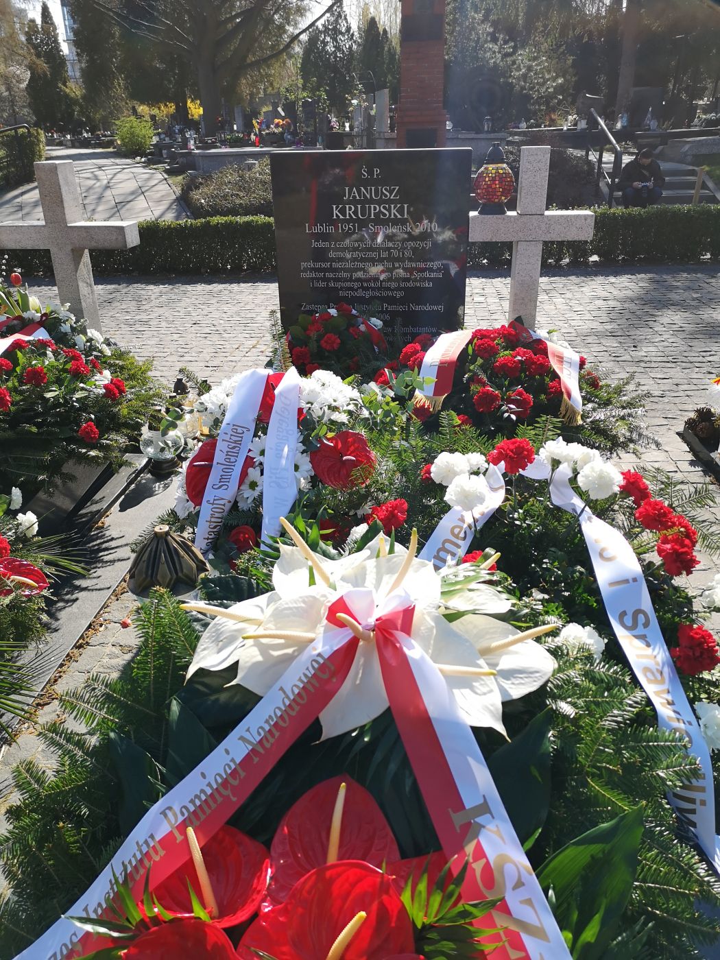 Na warszawskich Powązkach Wojskowych zastępca dyrektora Biura Prezesa i Komunikacji Społecznej Instytutu Pamięci Narodowej Joanna Pobocha-Górkiewicz złożyła wiązanki od prezesa i pracowników Instytutu na grobie Janusza Krupskiego oraz pod pomnikiem Ofiar Katastrofy Smoleńskiej.