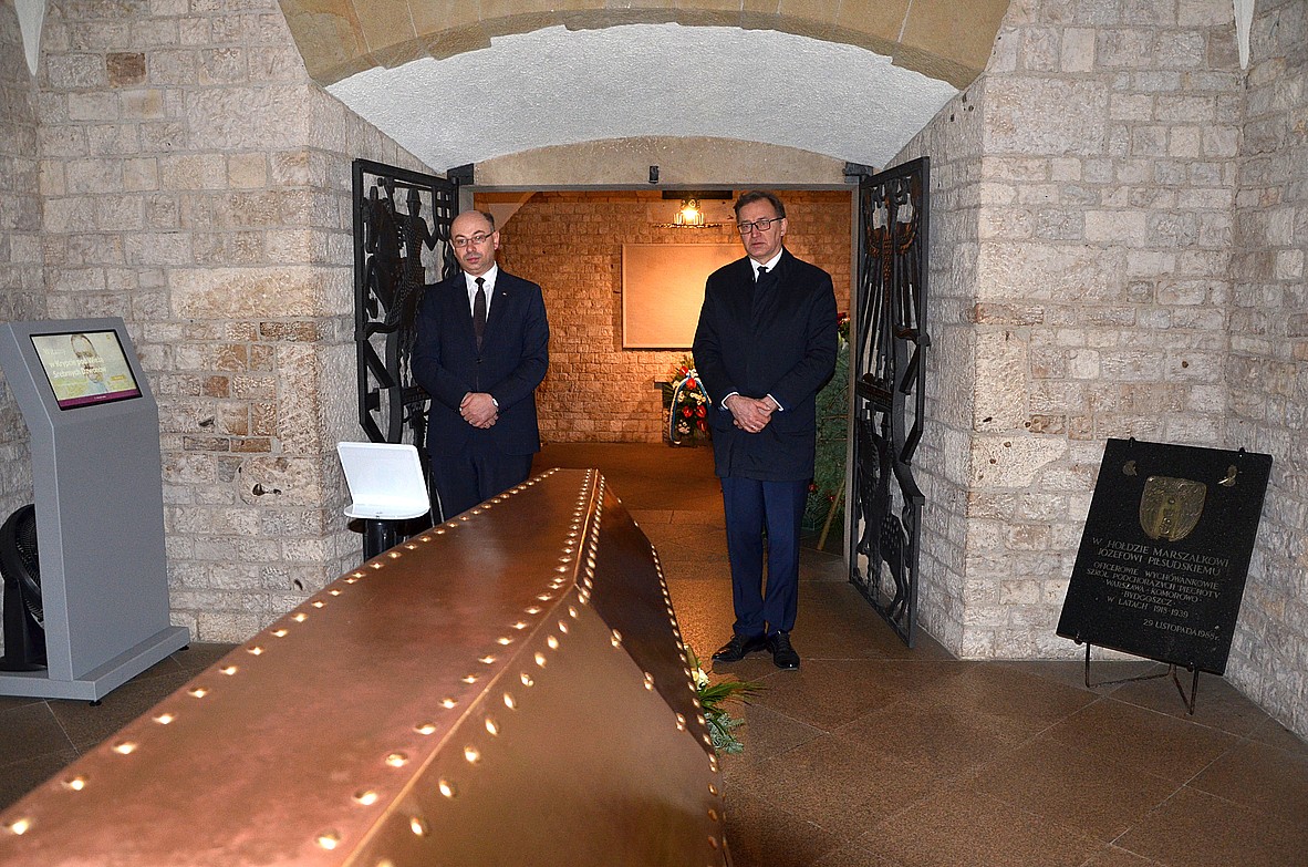 Przedstawiciele IPN odmówili modlitwę przy trumnie marszałka Józefa Piłsudskiego na Wawelu – 10 kwietnia 2020. Fot. Janusz Ślęzak (IPN)