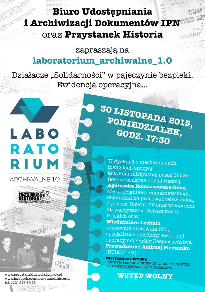 Przystanek Historia – Centrum Edukacyjne IPN im. Janusza Kurtyki oraz Biuro Udostępniania i Archiwizacji Dokumentów IPN zapraszają na warsztaty z cyklu Laboratorium_archiwalne 1.0. Zajęcia odbędą się 30 listopada (poniedziałek), o godz. 17:30, w Centrum Edukacyjnym Przystanek Historia, przy ul. Marszałkowskiej 21/25 w Warszawie.