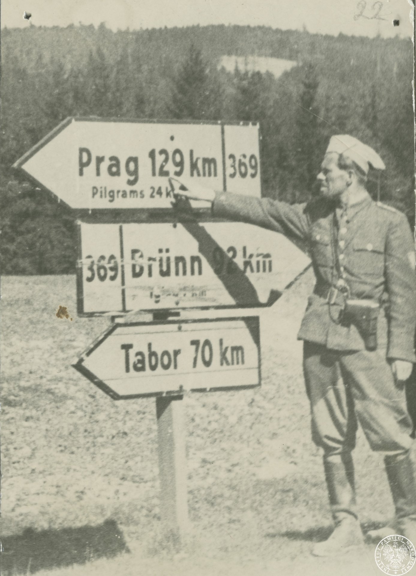 kpt. Henryk Figuro-Podhorski ps. „Step” [?] stoi przy drogowskazie do Pragi w czasie marszu Brygady Świętokrzyskiej NSZ przez Czechosłowacje. autor: nieznany, 5 V 1945 - 30 VI 1945 r. Fot. AIPN