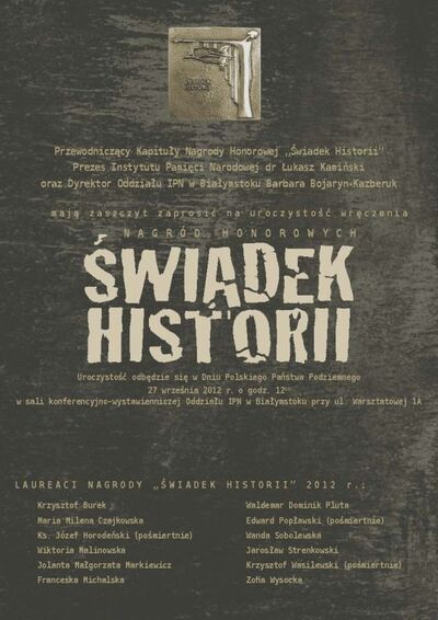 To już IV edycja nagrody ustanowionej w 2009 r. przez śp. Janusza Kurtykę, ówczesnego Prezesa Instytutu. Pomysł nagrody zrodził się w białostockim oddziale IPN. Jej celem jest honorowanie osób w sposób szczególny działających na rzecz przypominania o najnowszej historii Polski. W ciągu czterech lat nagrodę „Świadek Historii” otrzymało 41 osób, wśród nich śp. Ryszard Kaczorowski, ostatni Prezydent RP na uchodźstwie oraz metropolita białostocki arcybiskup Edward Ozorowski.