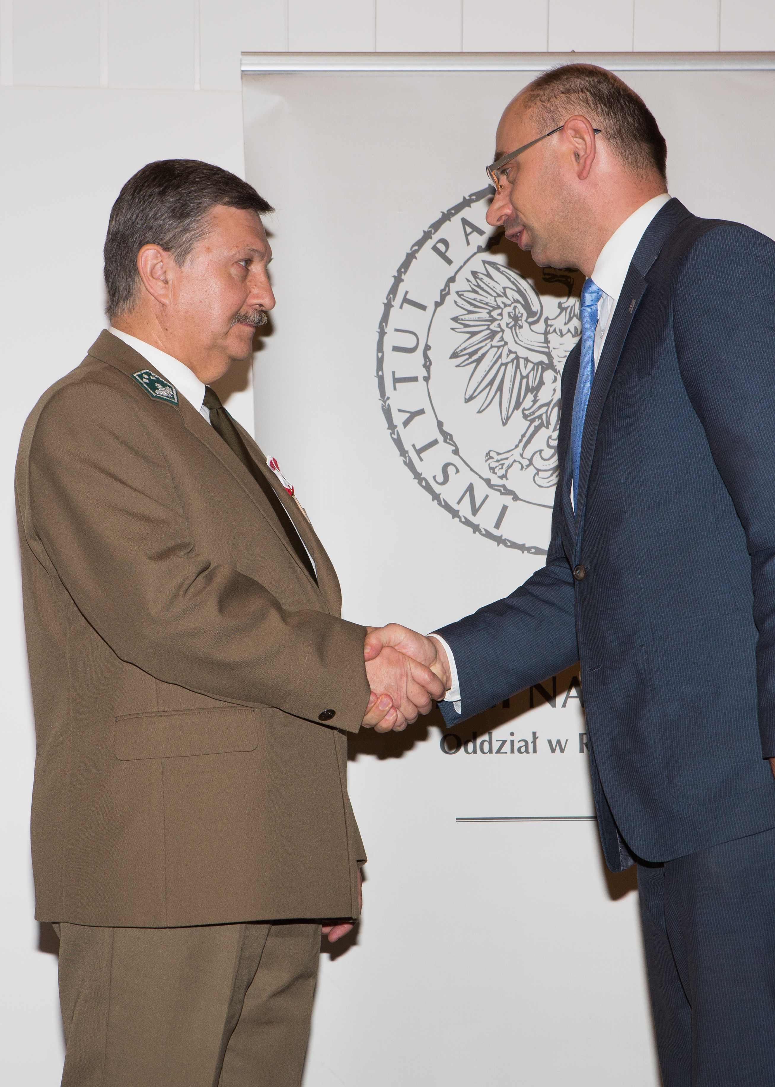 Edward Marszałek odbiera odznaczenie z rąk wiceprezesa IPN dr. Mateusza Szpytmy -