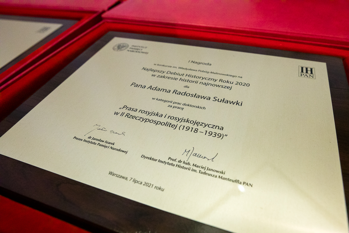 7 lipca 2021 o godz. 12.00 w Centrum Edukacyjnym „Przystanek Historia” przy ul. Marszałkowskiej w Warszawie odbyła się uroczystość wręczenia nagród laureatom XIII edycji konkursu im. Władysława Pobóg-Malinowskiego na „Najlepszy Debiut Historyczny Roku w zakresie historii najnowszej”. Konkurs jest adresowany do autorów niepublikowanych prac magisterskich i doktorskich, poświęconych historii Polski i Polaków w XX wieku.