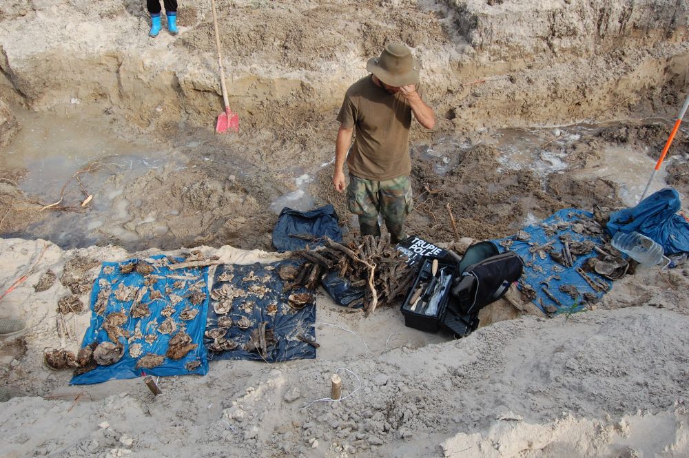 „Trupie pole”, archeolog Olaf Popkiewicz w czasie ekshumacji (2011) -