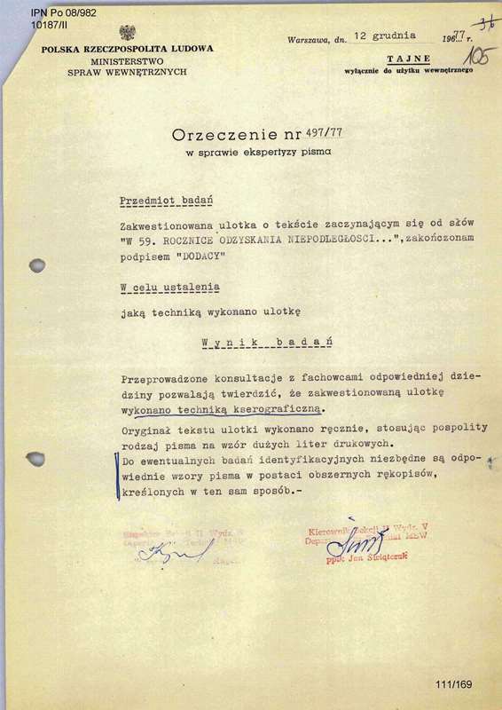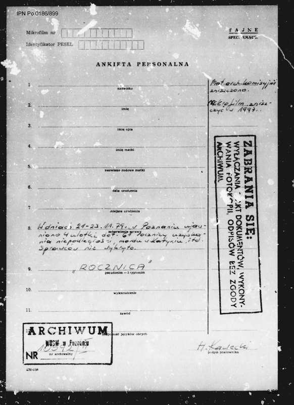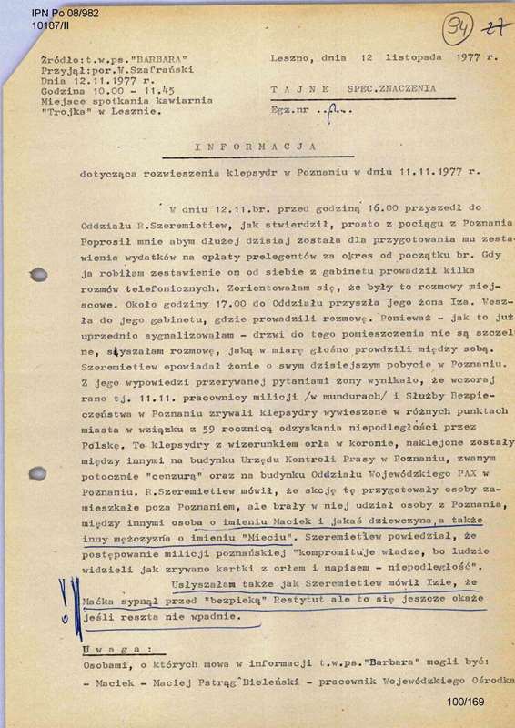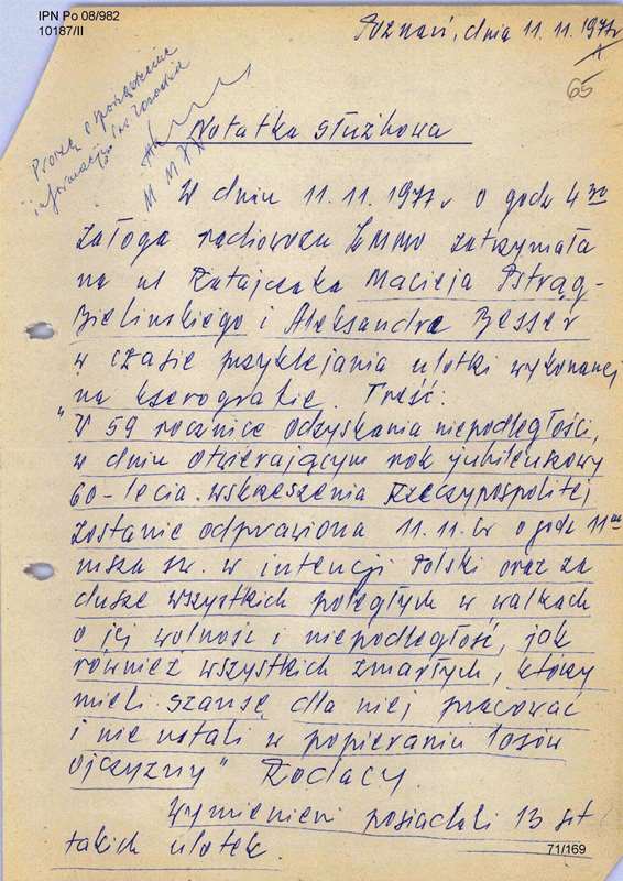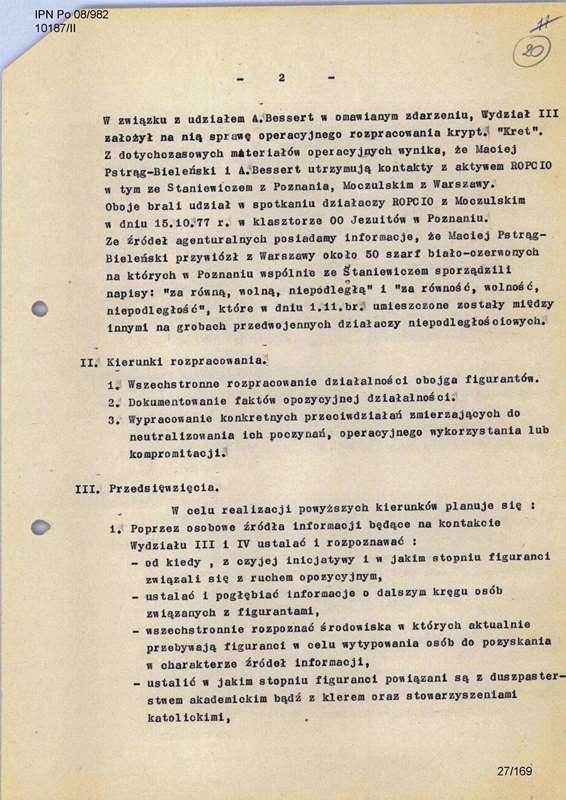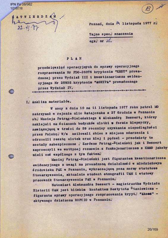 1–7: IPN Po 08/982 – dokumentacja sprawy operacyjnego rozpracowania krypt. „Kret” dot. kontroli operacyjnej Aleksandry Bessert, zatrzymanej za naklejanie na ścianach budynków ulotek nawiązujących w treści do 59. rocznicy odzyskania niepodległości. Materiały z 10–11 listopada 1977 r., zatrzymanie Bessert i Macieja Pstrąg-Bieleńskiego naklejających ulotki w formie klepsydr w rejonie ul. Ratajczaka i 27 Grudnia.