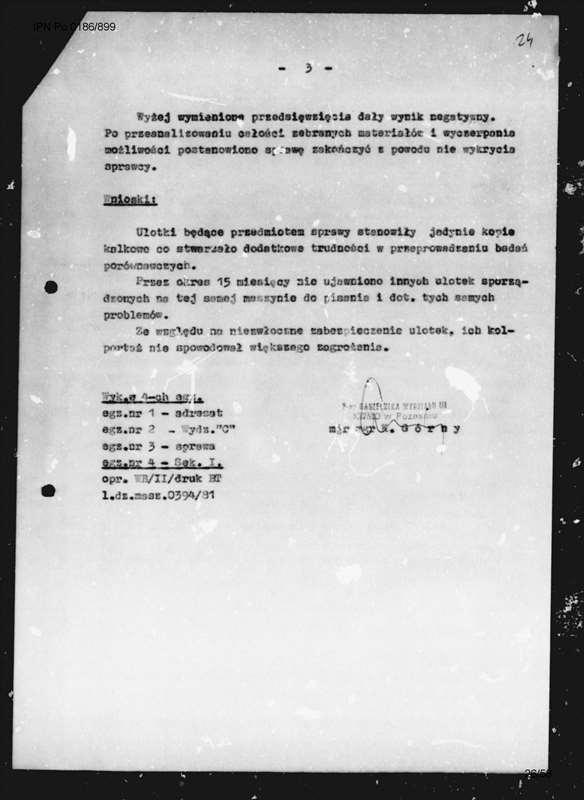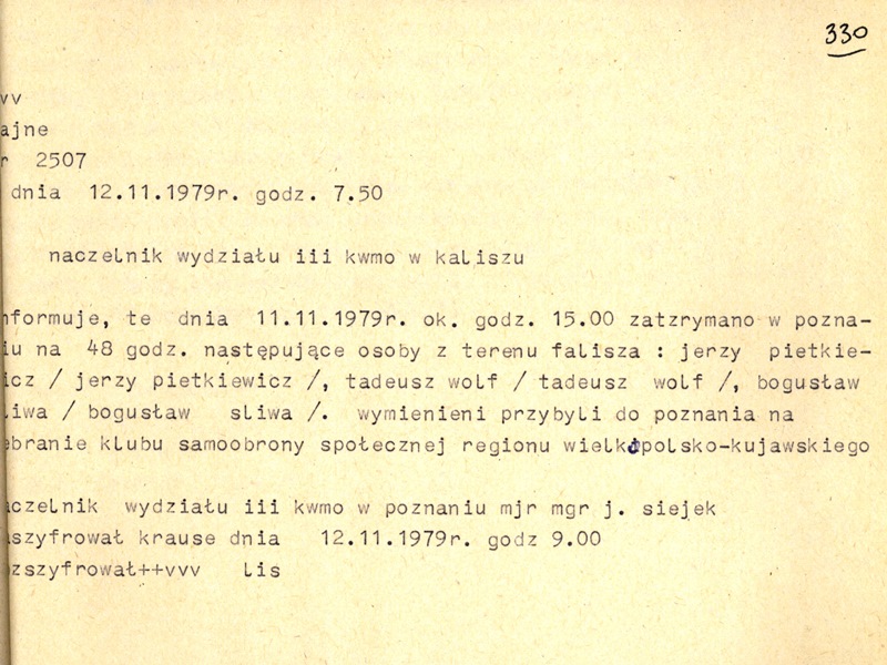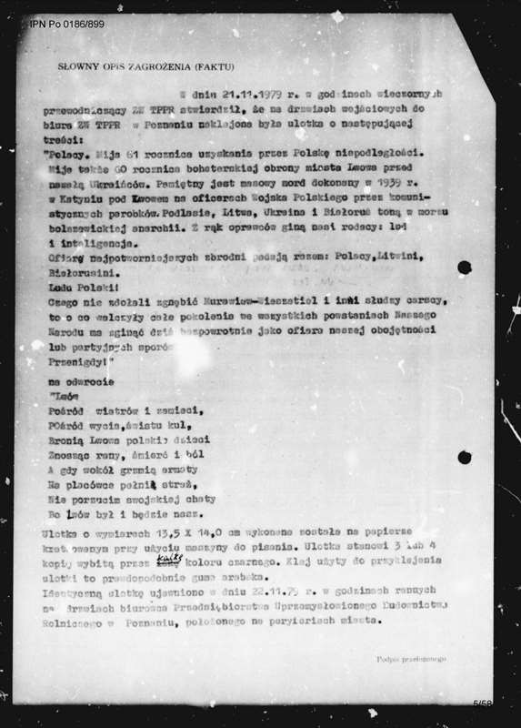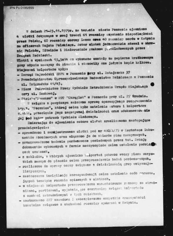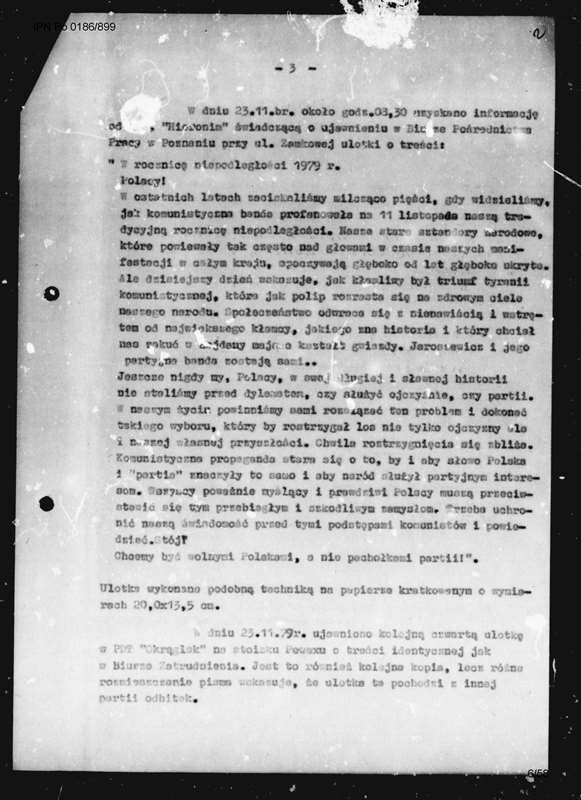 12–18: IPN Po 0186/99 – dokumentacja SOR krypt. „Rocznica” dot. kolportażu rocznicowych ulotek sporządzonych z okazji 61. rocznicy odzyskania niepodległości, ujawnienie ulotek przez SB w dniach 21–23 listopada 1979 r. Jedną z ulotek naklejono na drzwiach wejściowych do biura Zarządu Wojewódzkiego Towarzystwa Przyjaźni Polsko-Radzieckiej, w Biurze Pośrednictwa Pracy, w Przedsiębiorstwie Uprzemysłowionego Budownictwa Rolniczego oraz w PDT „Okrąglak” na stoisku „Peweksu” w Poznaniu.
