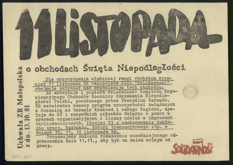 19: IPN Po 1046/880 – zbiory biblioteki Kórnickiej PAN, uchwała ZR Małopolska NSZZ „Solidarność” z 13 października 1981 r. w sprawie obchodów święta niepodległości.