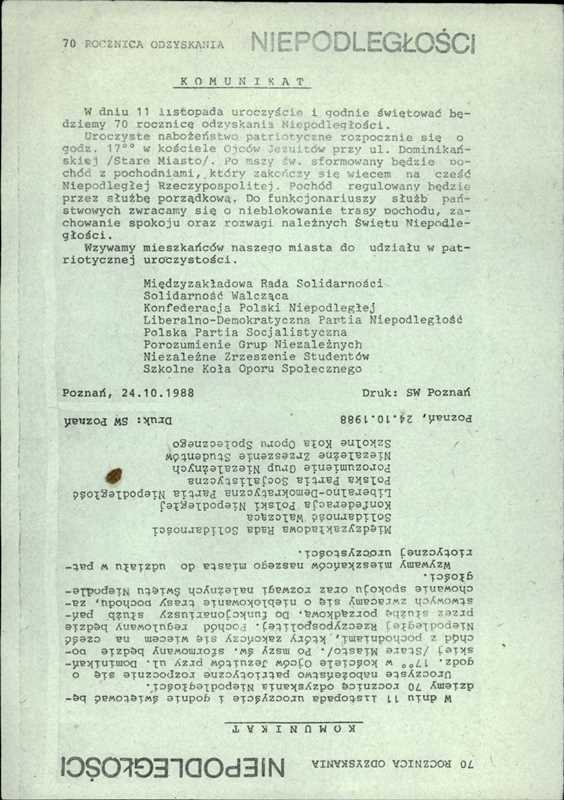 23: IPN Po 06/267, t. 29 – komunikat poznańskiej opozycji solidarnościowej z okazji 70. rocznicy odzyskania niepodległości, o godz. 17 zaplanowano mszę świętą w kościele Ojców Jezuitów przy ul. Dominikańskiej, a następnie pochód z pochodniami oraz wiec uczestników wydarzenia.