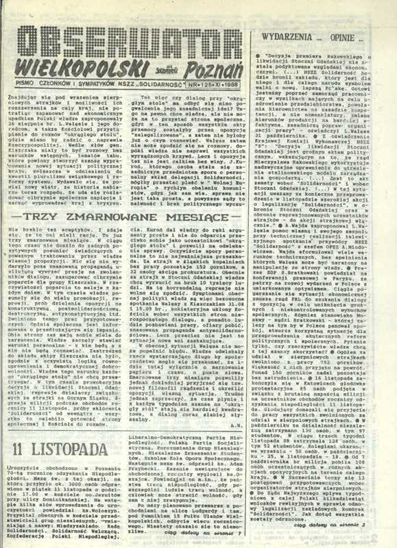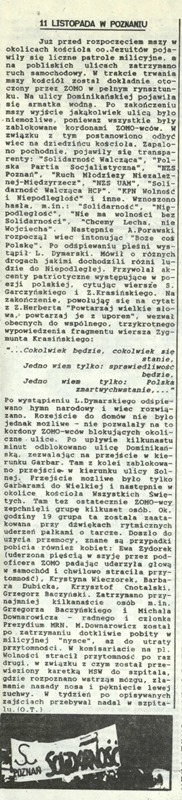 24–25: IPN Po 06/267, t. 29 – „Obserwator Wielkopolski” z listopada 1988 r., relacja z obchodów 70. rocznicy odzyskania niepodległości, informacja o zablokowaniu przez władzę planowanego marszu z pochodniami, brutalna interwencja ZOMO, odnotowano przypadki pobicia uczestników (m.in. opozycjonistki Ewy Zydorek i Michała Downarowicza pobitego w milicyjnej nysce).