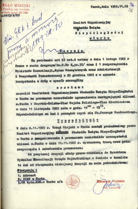 27: IPN Po 704/12, t.3 – zgoda władz Urzędu Miasta w Turku na przemarsz ulicami miasta uczestników obchodów święta niepodległości zorganizowanego przez tzw. Komitet Organizacyjny Obchodów Święta Niepodległości w Turku.