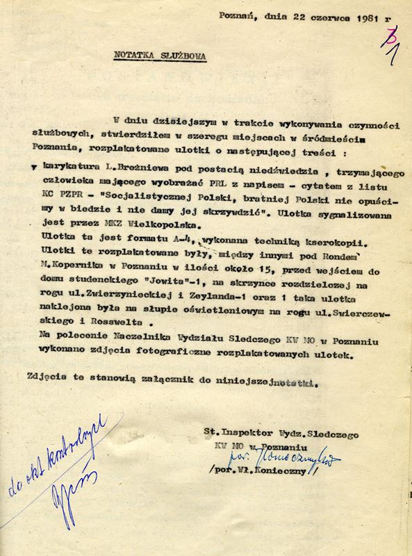 W 1981 r. wydawaniem licznych publikacji bez zezwolenia Okręgowego Urzędu Kontroli Prasy, Publikacji i Widowisk w Poznaniu zajmował się m.in. Międzyzakładowy Komitet Założycielski, a od lipca Zarząd Regionu NSZZ „Solidarność”. Wydawał on również druki zawierające satyrę na ówczesną sytuację gospodarczą i polityczną. Jednym z najgłośniejszych przypadków okazało się wydrukowanie plakatów z karykaturą przedstawiającą niedźwiedzia przypominającego Leonida Breżniewa – I sekretarza KC Komunistycznej Partii Związku Radzieckiego. Niedźwiedź trzymał w łapie malutkiego, chudego człowieka z napisem PRL i wypowiadał słowa: „Socjalistycznej Polski, bratniej Polski nie opuścimy w biedzie i nie damy jej skrzywdzić ...” Było to zdanie kończące list KC KPZR do KC PZPR wystosowany 5 czerwca 1981 r.